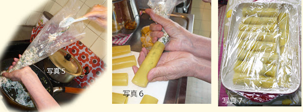 6.5.を絞り袋に入れて(写真5)、カネロニの中に詰める(口金は使わない)。そのときカネロニが割れないように注意。カネロニの内側に出来るだけすき間が残らないように慎重にきっちりと詰めて行く(写真6)。オーブン用のキャセロール(または陶器のグラタン皿)の内側にオリーブ・オイル(分量外)を塗り、具の詰まったカネロニを並べる。キャセロールにラップして冷蔵庫で保存できる(写真7)。